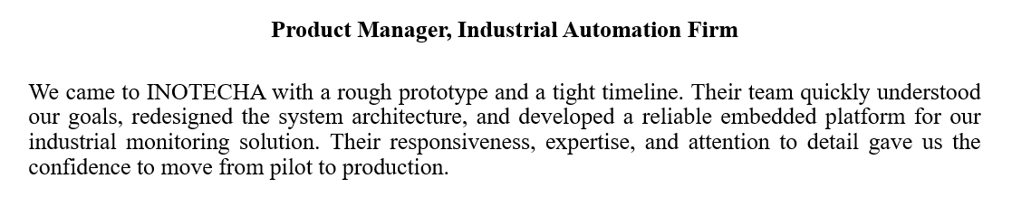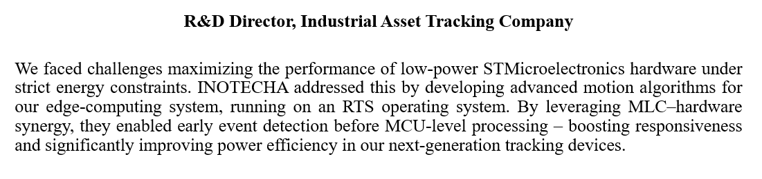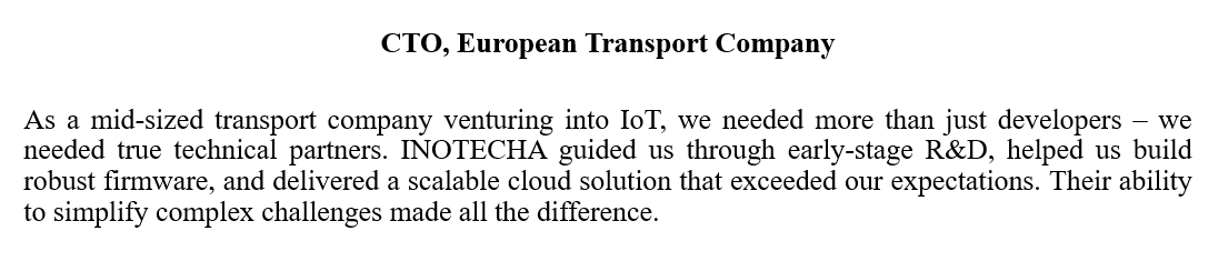 INOTECHA – Europos R&D ir programinės įrangos inžinerijos įmonė, kuri padeda verslui greičiau augti. Mūsų kompaktiška, bet daugiasritė PhD lygio specialistų komanda sujungia tyrimus, duomenų mokslą, firmware kūrimą ir pramonės automatizaciją, kad naujausios technologijos taptų jūsų konkurenciniu pranašumu. Greitai prisitaikome prie rinkos pokyčių, diegiame patentuotus sprendimus – pavyzdžiui, logistikos saugumo srityje – ir paverčiame sudėtingas technologijas paprastais, veiksmingais įrankiais jūsų verslui.
